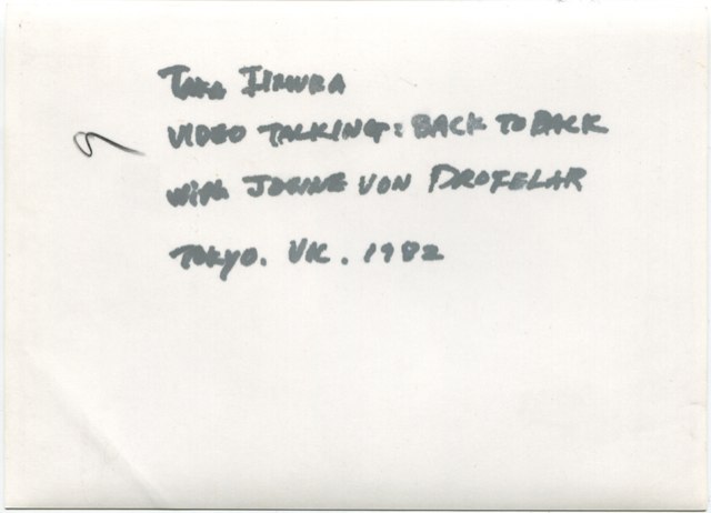Backside photo with text: Taka Iimura video talking: back tot back with Josine Droffelaar. Japan 1982