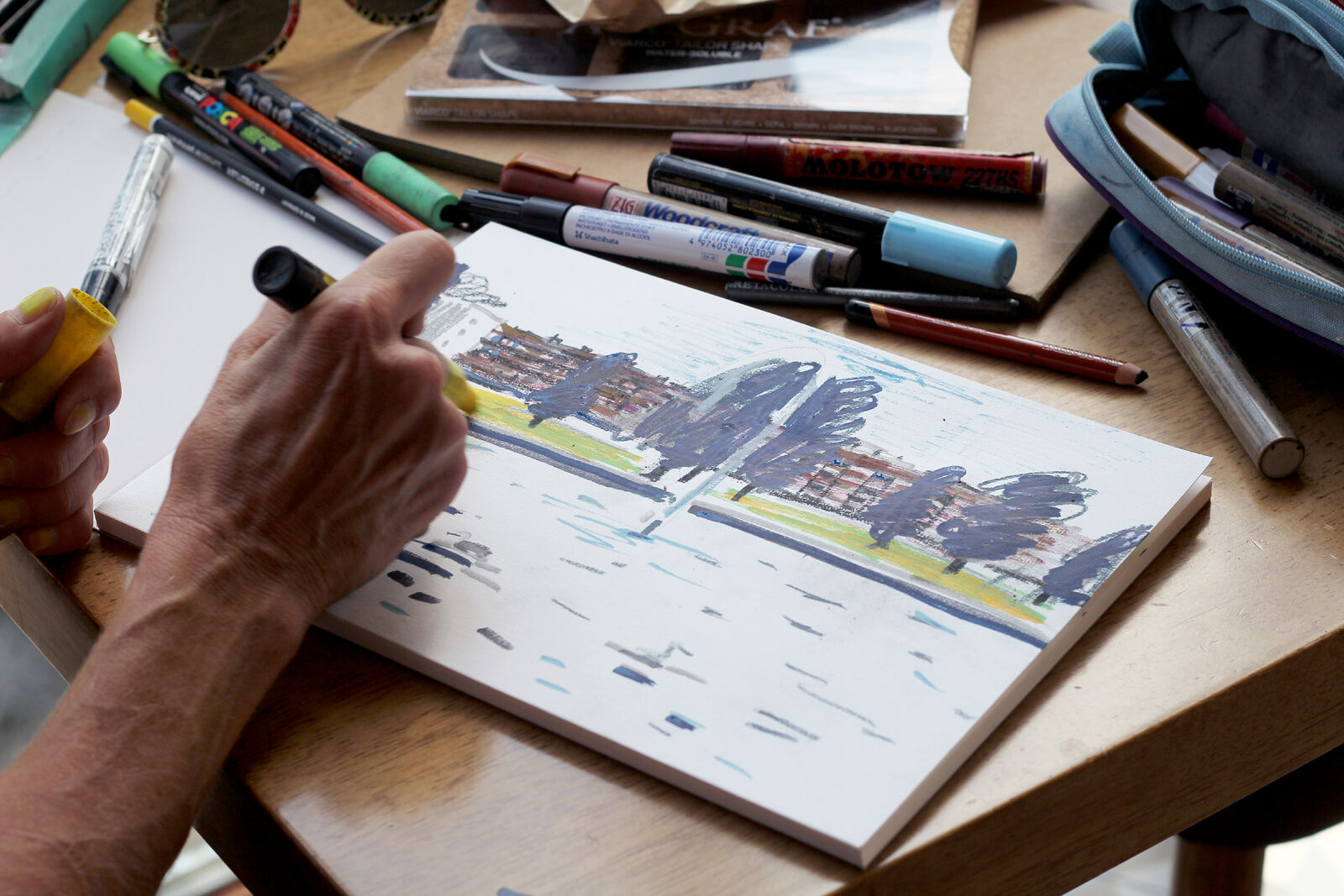 Waarom deze kunstenaars, hier, nu? Eén van de antwoorden is dat ik mijn intuïtie heb gevolgd en voelde dat de levendige en gevarieerde schetsen en schilderijen van deze groep - zo direct uit het leven gegrepen- nieuwe manieren zouden bieden om met Amsterdam in contact te komen. Zoals zoveel centra van metropolen vandaag de dag, is de stad in volle ontwikkeling en vaak lijken krachten, die haast onzichtbaar zijn, de koers van die transformatie te bepalen. Vastgoed, toerisme en de overvloedige beelden die worden gecreëerd om deze industrieën te promoten, domineren de verbeelding van hoe (en welke) buurten het concept van Amsterdam vormen. Zowel billboards met fotografische weergaven van het nu, als computergestuurde beelden van wat er straks moet komen.1 Wat kunnen, in dit licht, viltstiften of pennen of potlood doen op een bescheiden formaat papier?