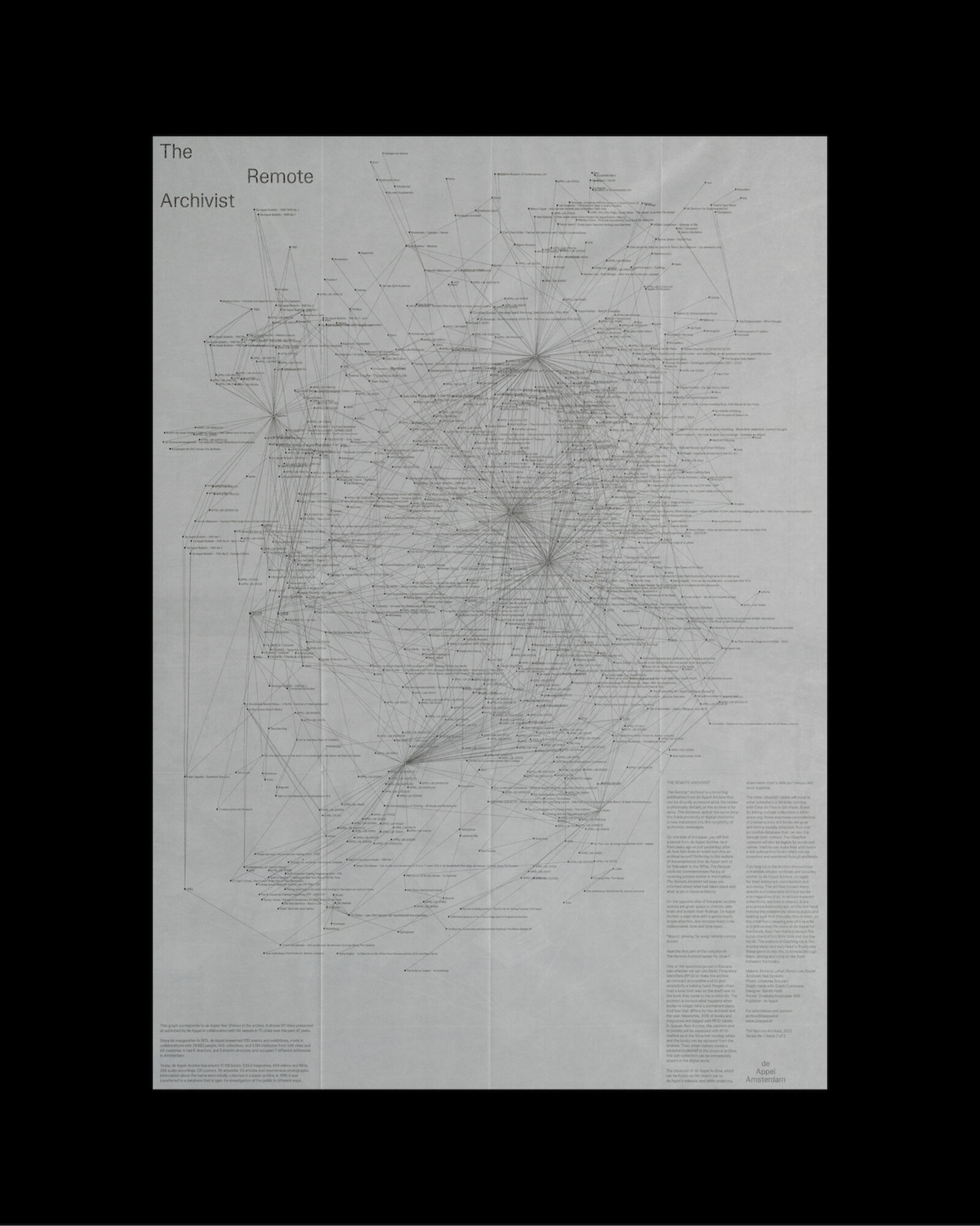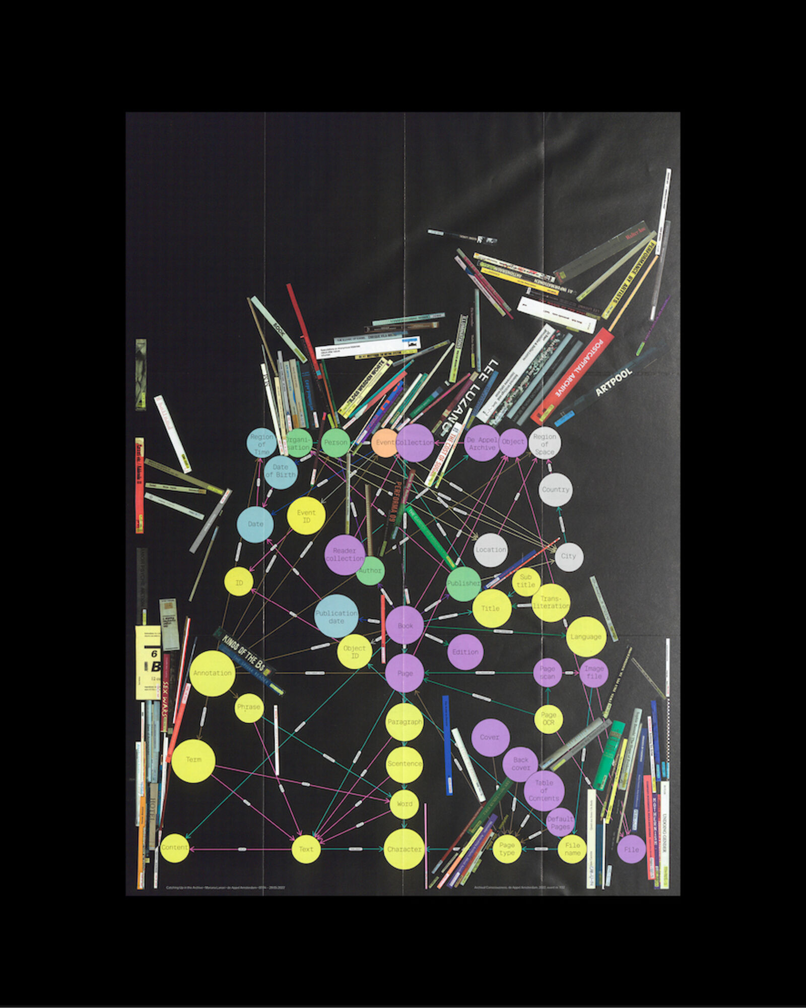 Each book and magazine (16000 pieces) was lovingly handled, looked at and considered to make neat stacks of books that have no made-up connection, except that they come from a carefully composed collection that presents the history and story of de Appel. The visitors meandered between the stacks and their eyes wandered over the books and they made their own choices and connections, rearranging the stacks over and over. On special tables, called Silverfish, the visitors captured the chosen materials and collectively created a digital library at biblio-graph.org. Biblio-graph is a web application for cultural libraries and archives which Lanari developed together with Remco van Bladel. It proposes a way of browsing books and their networks, which otherwise would be hidden behind a search bar. A community-sourced environment for data aggregation, mapping and visualization. The Silverfish is now a permanent part of de Appel’s Archive and everyone is welcome to expand Biblio-graph.